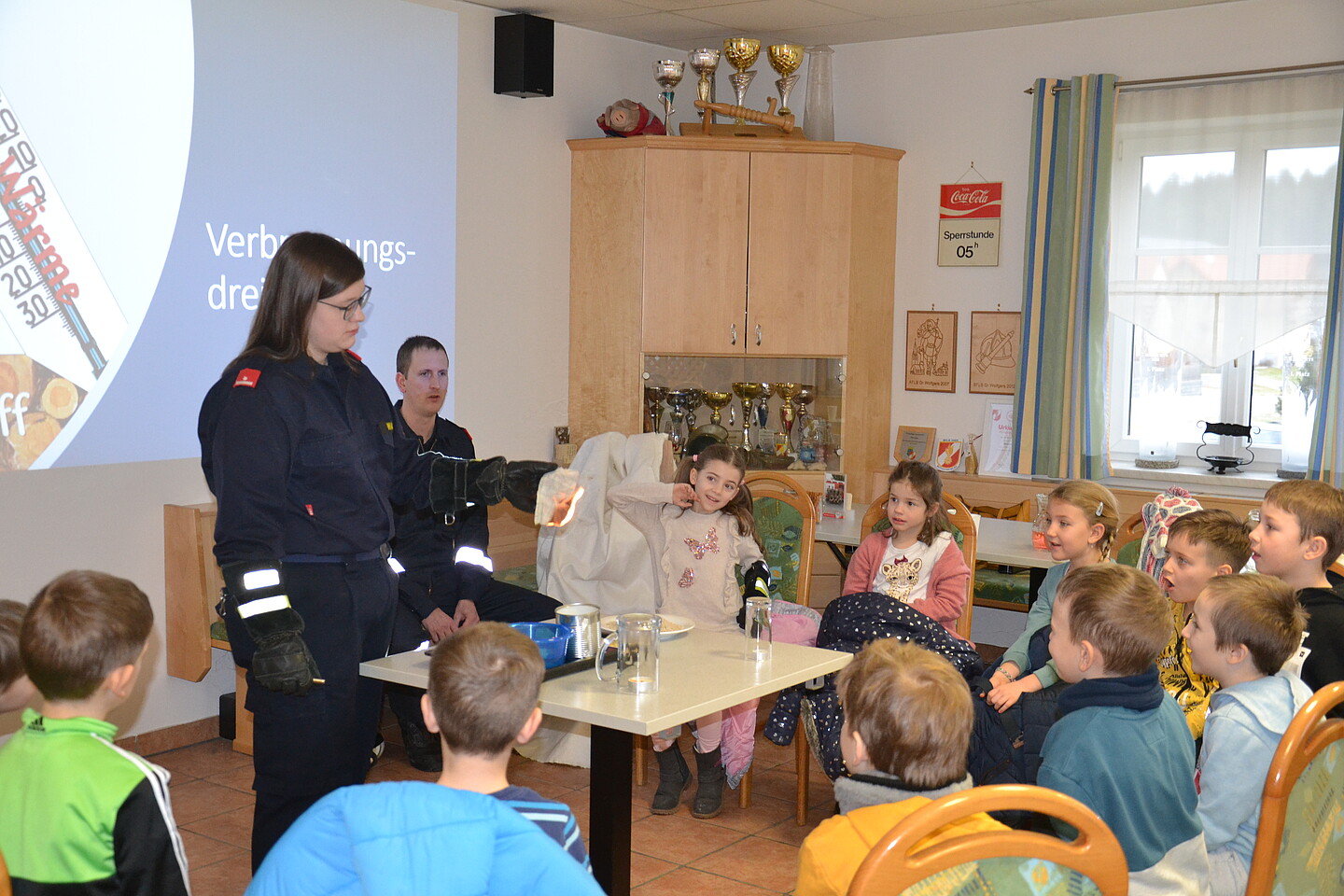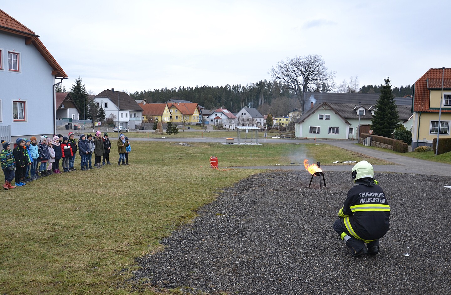 In einem kurzen Vortrag wurden den Volksschülern die Notrufnummern, das richtige Verhalten in Notfällen und die Bekleidung der Feuerwehr nähergebracht. Danach ging es für die Kinder mit einem Stationsbetrieb weiter. Bei der ersten Station wurde die Brennbarkeit von verschiedenen Materialien vorgeführt und die richtigen Löschmaßnahmen dieser erlernt. Bei der zweiten Station konnten die Feuerwehrfahrzeuge besichtigt werden und diverse Gerätschaften ausprobiert werden. Im Anschluss wurde den Volksschülern noch ein Fettbrand demonstriert. Zum Abschluss wurden die Kinder mit den Feuerwehrfahrzeugen zurück in die Volksschule gebracht.
