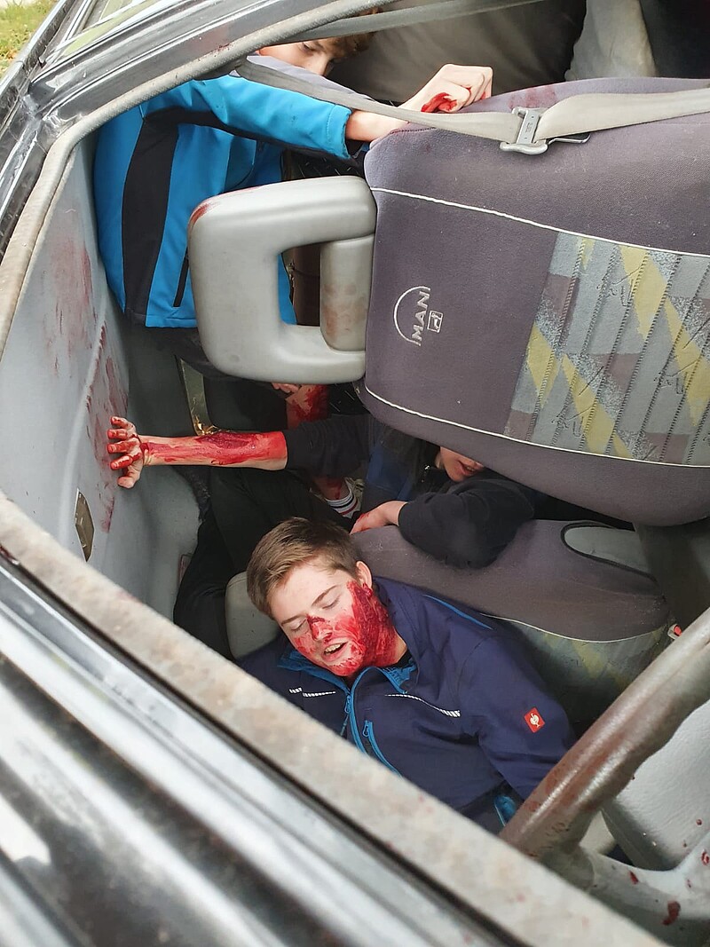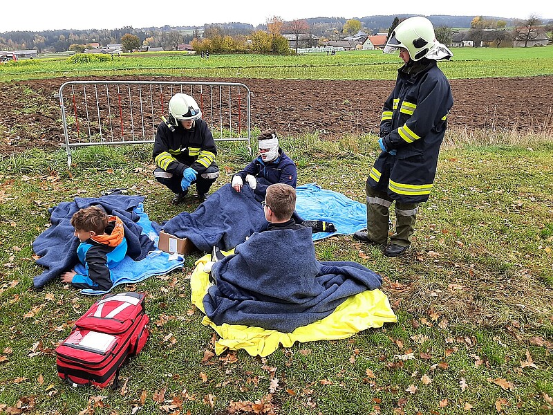 Um 09:05 Uhr wurden die Feuerwehren von der Landeswarnzentrale zu der Übung alarmiert. Übungsannahme war ein Verkehrsunfall mit mehreren eingeklemmten Personen und ein brennender Holzstoß in direkter Nähe.