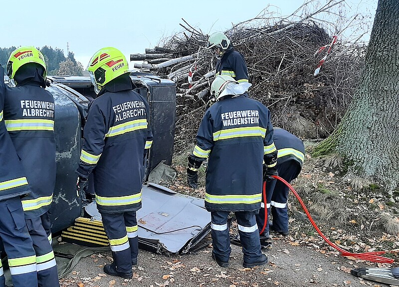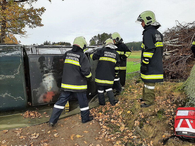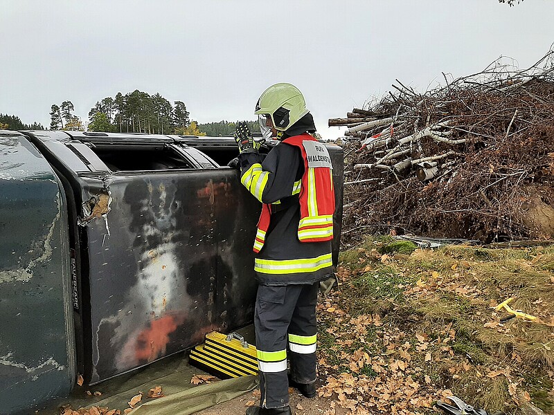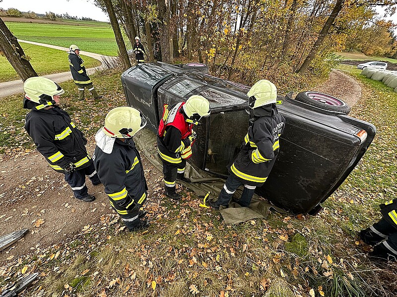 Bei der ersten Erkundung wurde ein auf der Seite liegender PKW vorgefunden, in dem sich drei verletzte Personen befanden, die sich lautstark bemerkbar machten. Unmittelbar neben dem PKW stand ein Holzstoß in Vollbrand, der übergreifen zu drohte. Unmittelbar wurde mit der Brandbekämpfung begonnen um sich dem Fahrzeug besser annähern zu können. Nach sichern des PKWs gegen Umkippen wurde die Menschenrettung durchgeführt. Die geretteten Personen wurden im Anschluss erstversorgt. Zusätzlich wurde von einem Teich und einen Hydranten die Wasserversorgung zur Brandbekämpfung sichergestellt.