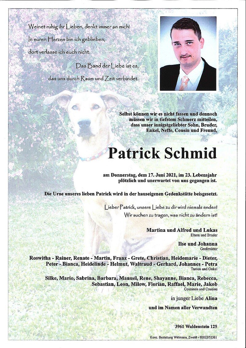 Die Verabschiedungsfeier und die Urnenbeisetzung für Patrick finden am 03. Juli 2021 um 16:00 Uhr im Garten der Familie Schmid bei der hauseigenen Gedenkstätte statt. Die Verabschiedung wird von Pastoralassistent Georg Kreuter geleitet. Alle die sich von Patrick verabschieden wollen sind dazu ab 15:00 Uhr herzlich eingeladen.