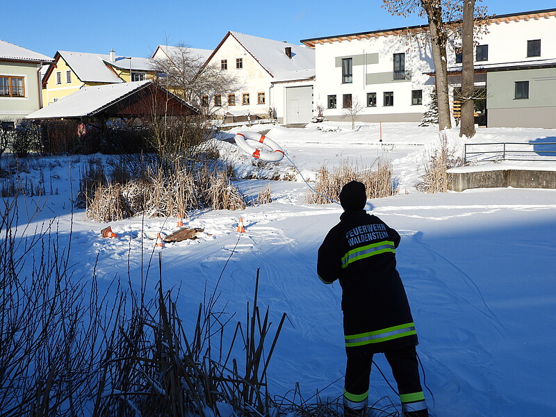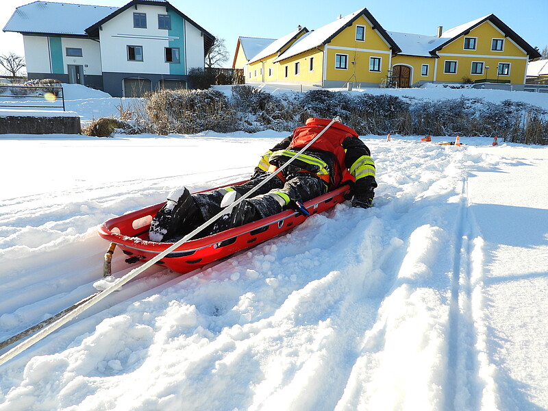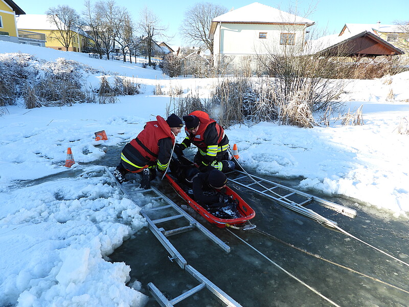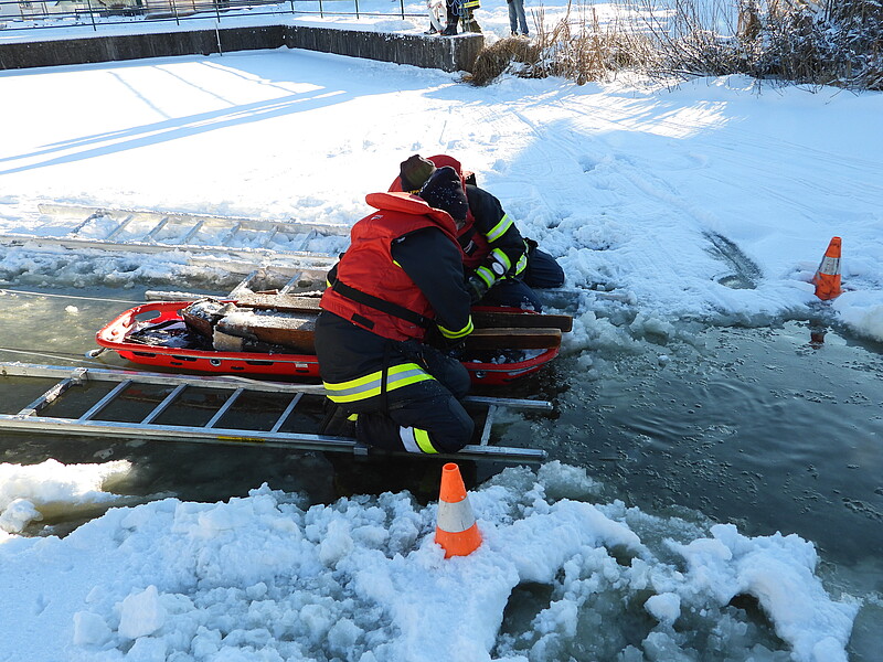 Das Szenario sah vor, dass eine Person im Löschteich eingebrochen war und sich nicht selbstständig aus dem Wasser befreien konnte. Da die Eisfläche instabil war, war eine direkte Annäherung ohne Sicherungsmaßnahmen nicht möglich. Die Einsatzkräfte mussten sich daher zunächst selbst dementsprechend mit Feuerwehrgurt, Auffanggurt, Rettungsweste und Rettungsleine sichern. Zur Annäherung an die verunfallte Person wurden Steckleiterteile auf die Eisfläche gelegt, um das Gewicht der Retter gleichmäßig zu verteilen und die Gefahr des weiteren Einbrechens zu minimieren. Über die improvisierte Rettungsbrücke gelangten die Einsatzkräfte rasch zur eingebrochenen Person, welche anschließend mittels Korbtrage ans Ufer gebracht werden konnte.