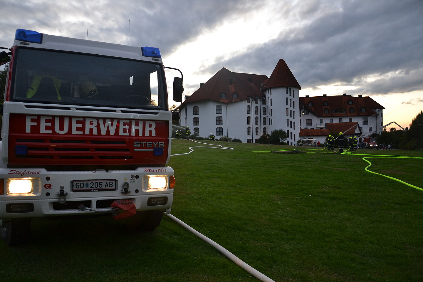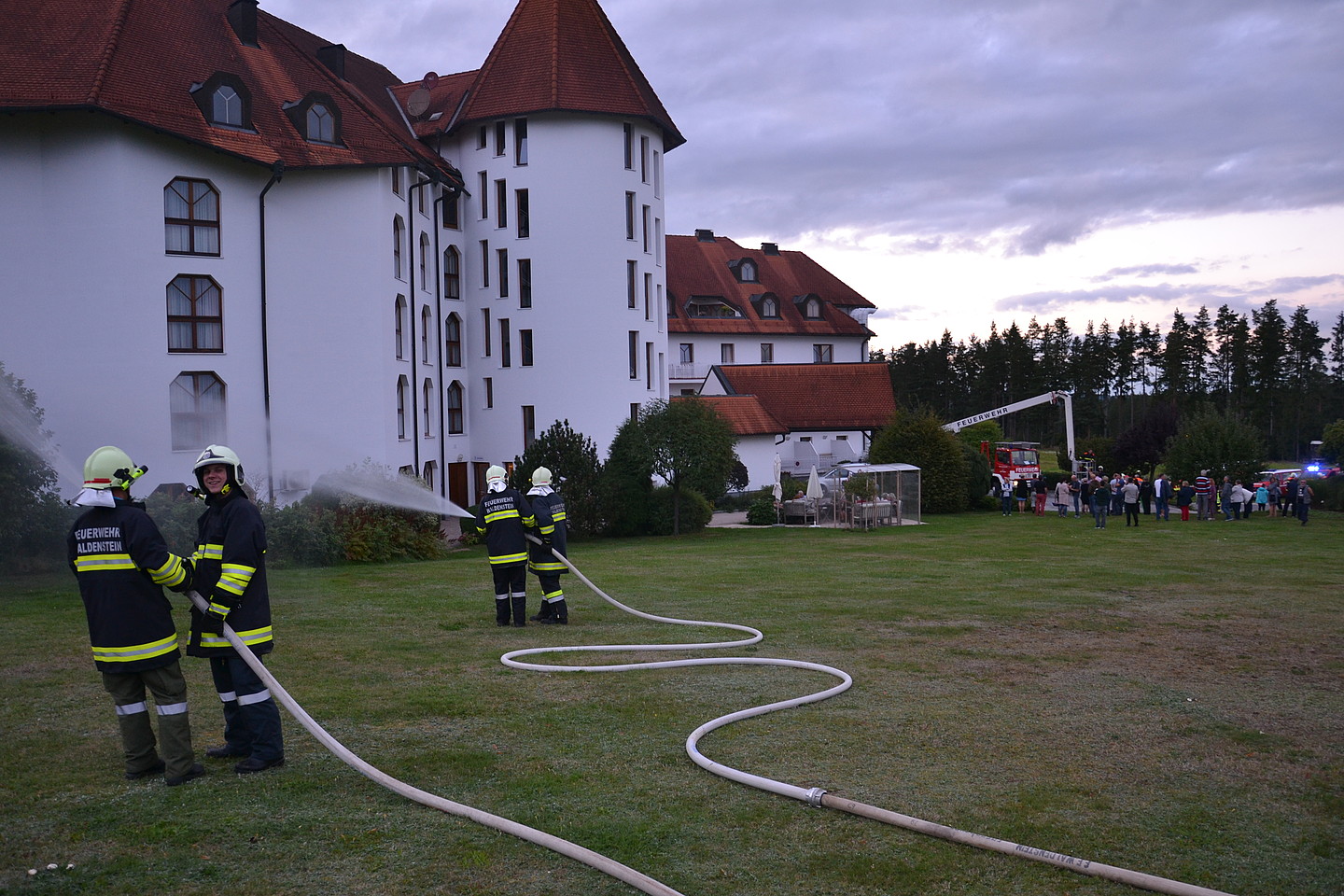 Um 18:40 Uhr wurden die Feuerwehren von der Landeswarnzentrale zu der Übung alarmiert. Übungsannahme war ein Brand im Kurhotel Leonardo bei dem zwei Personen vermisst wurden.