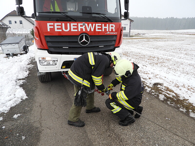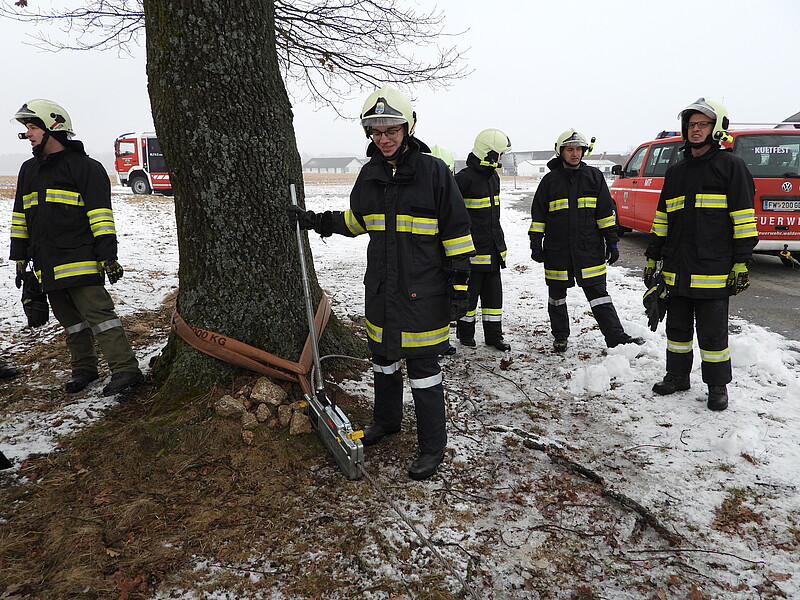 Es wurden unter anderem die Themen Seilwinde, Greifzug und die für den Einsatz dieser notwendigen Anschlagmittel behandelt. Besonderes Augenmerk wurde dabei auf die Kräfte, die im Einsatz auf die Anschlagpunkte und Anschlagmittel wirken gelegt. Ebenso wurden die Möglichkeiten, die sich bei der Verwendung von Umlenkrollen als „lose Rolle“ und „feste Rolle“ ergeben, beübt.