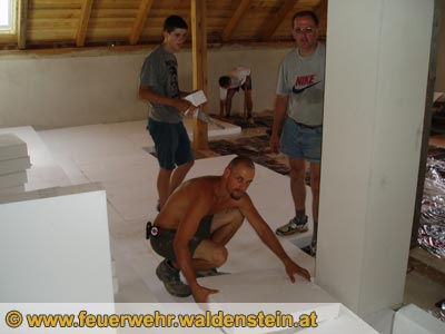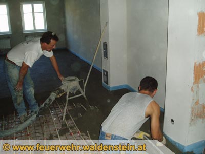 Jetzt wurde mit dem Innenputz begonnen, es wurden alle Räumlichkeiten vom Dachboden bis zum Keller innerhalb kürzester Zeit verputzt. Danach wurden alle Räume mit einem Estrich versehen.