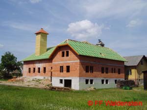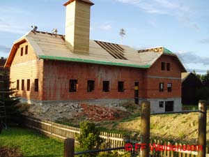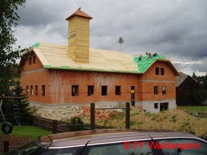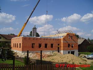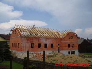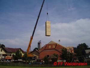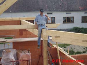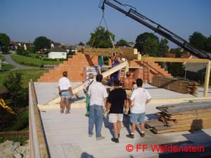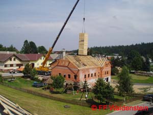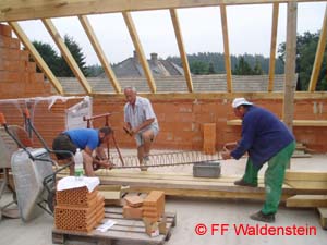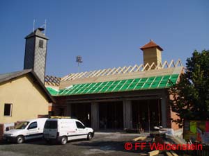 Nachdem die Arbeiten der Maurer abgeschlossen waren, wurde nun Mitte August der Dachstuhl montiert. Die Zimmerer haben in wenigen Tagen die Dachkonstruktion fertig gestellt, weiteres wurde der Schlauchturm auf das neue Feuerwehrhaus aufgesetzt. Die Dachdeckerarbeiten sind in den kommenden Wochen abgeschlossen worden.